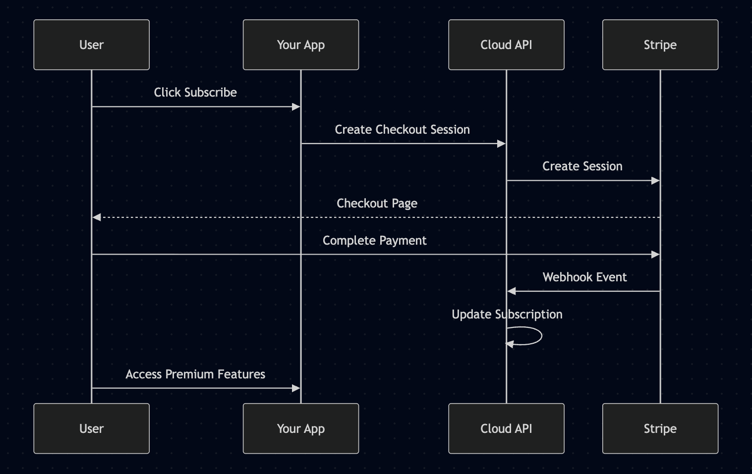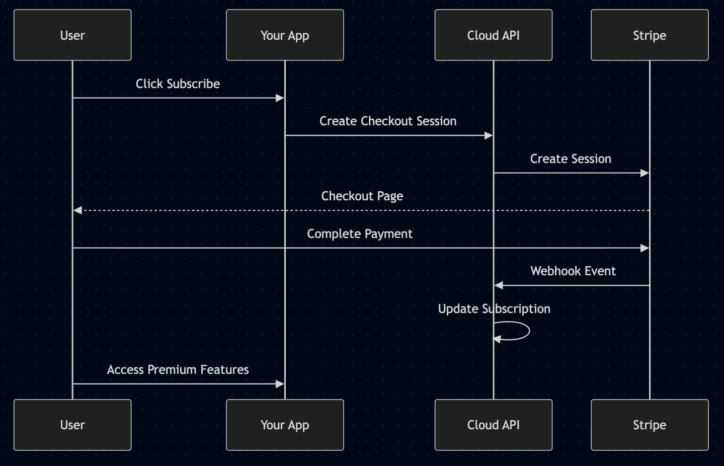 Cloud API automatically processes Stripe webhook events to keep subscription data synchronized:
